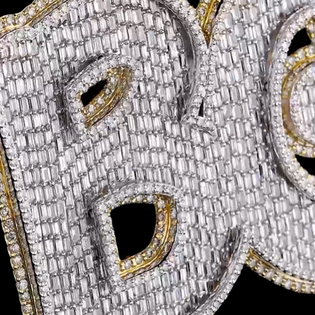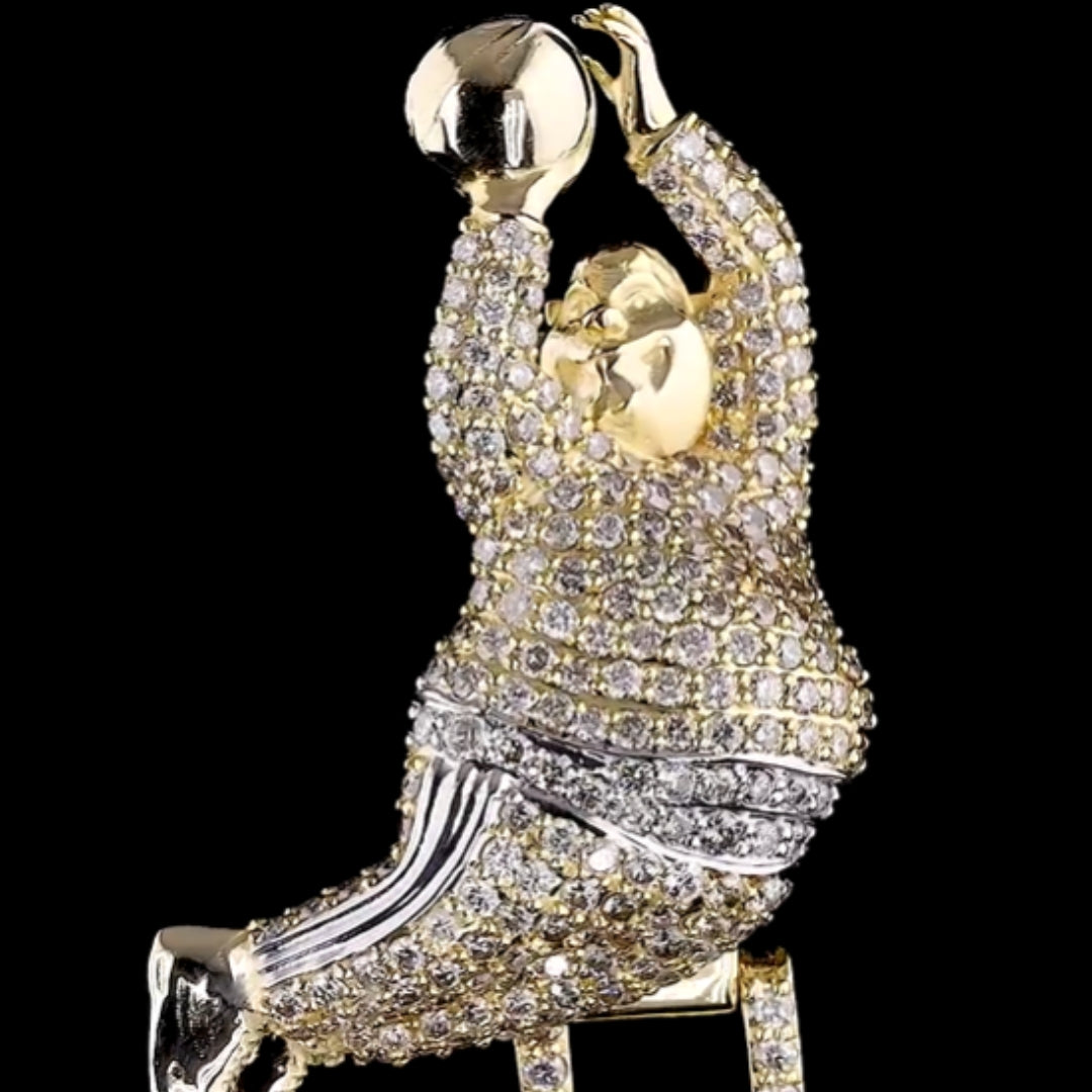 This is a beautifully designed pendant with alphabets BG.Sparkling Round And Baguette Diamonds are arranged in 2 levels to give best look. Cherry on the cake is the bail of the pendant with 3D designed basketball player.